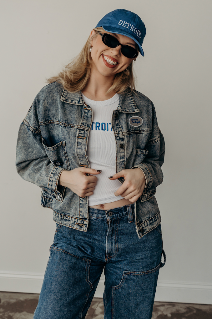 This Patch denim jacket is sooo cute for Game Day or remove the patches (they pin on) and add to your everyday wardrobe! This is a custom styl, it is cropped and wider, meant to be "oversized!" Go with true women’s size!