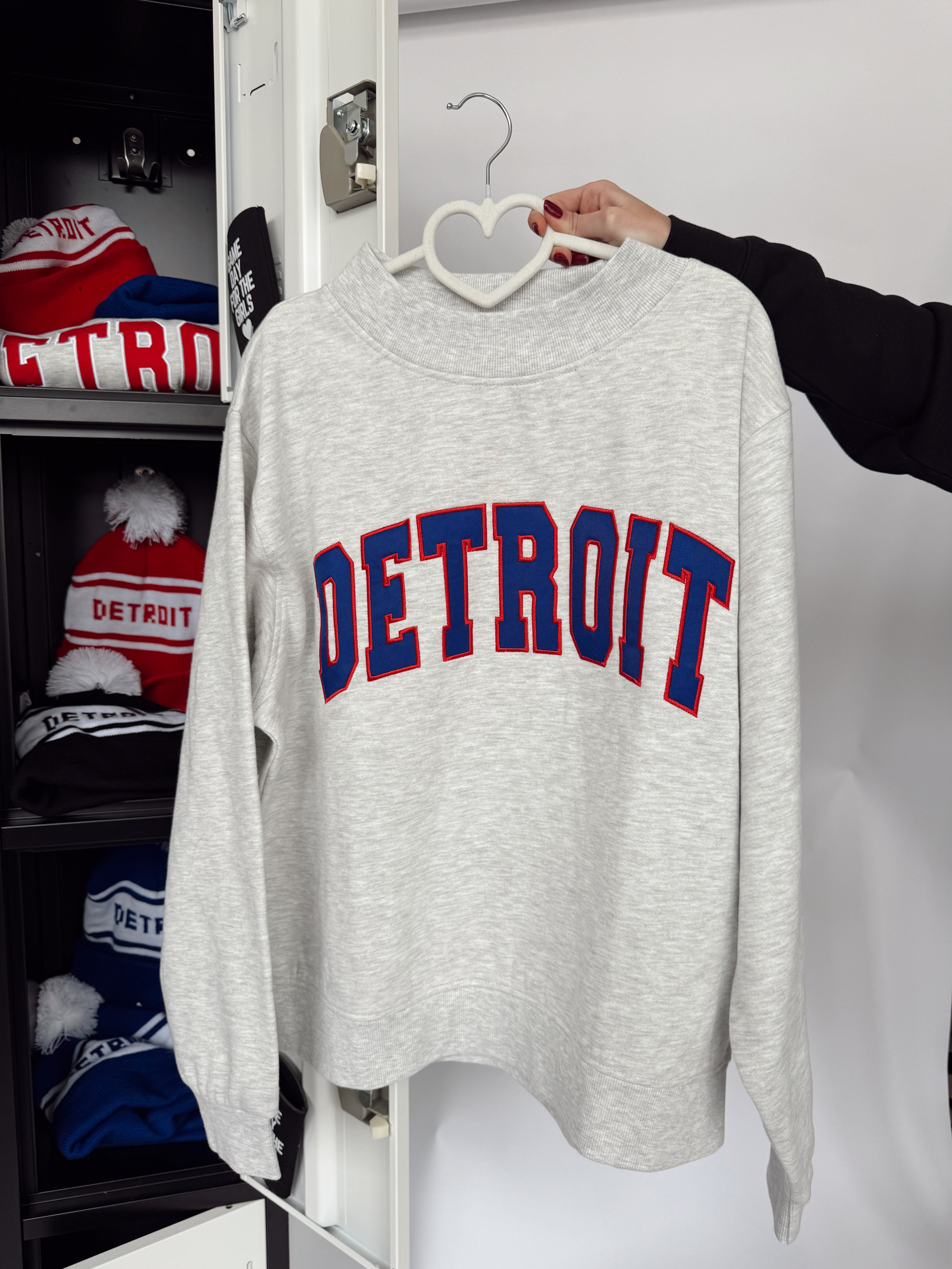 Our NEWEST Custom Garment is HERE! We are so excited to add the mockneck to our Detroit Game Day wardrobe! This ash grey mockneck sweatshirt has our signature embroidered applique patch Detroit on the front. This totally on trend style is PERFECT to wear with jeans or leggings.