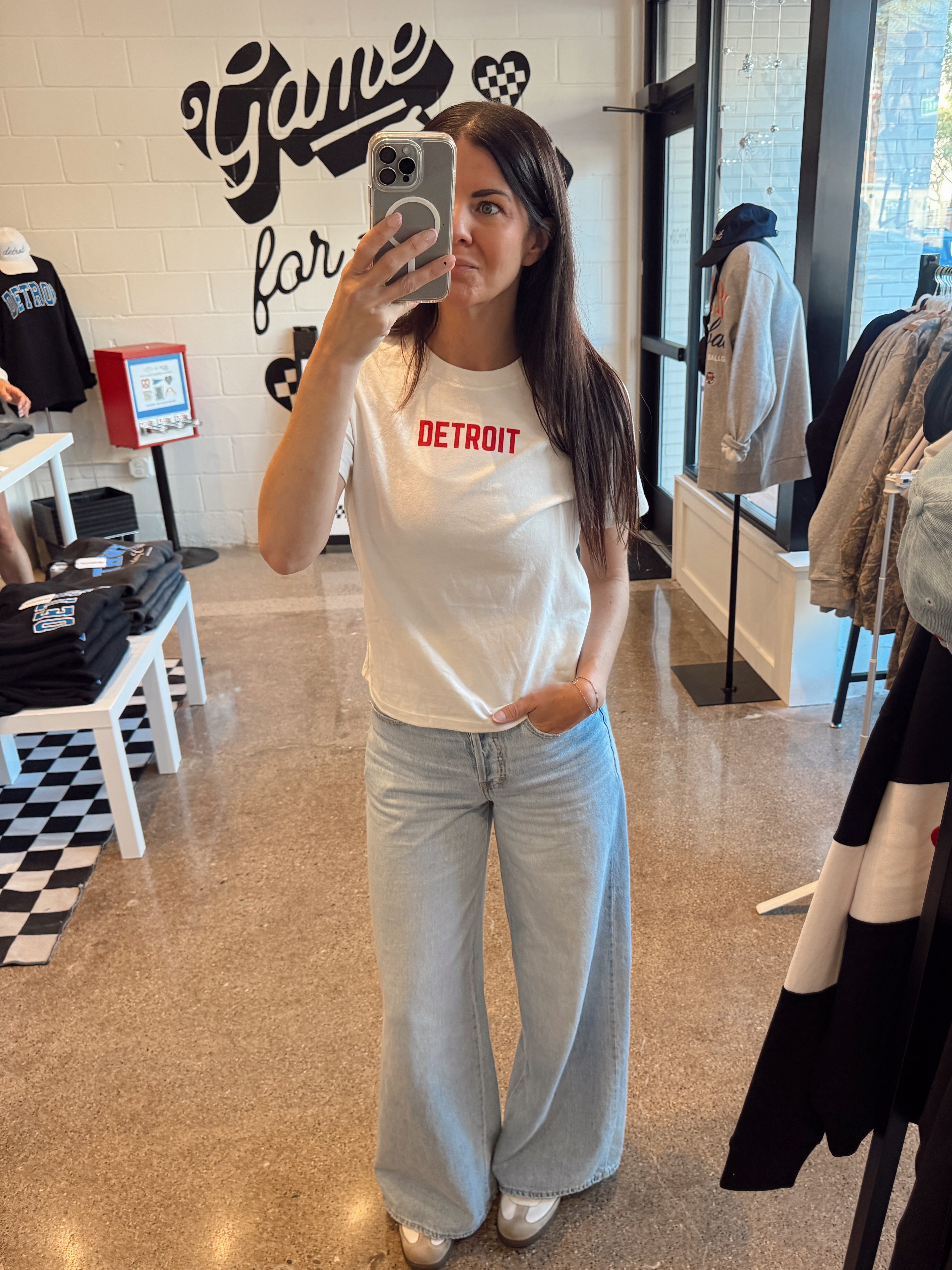 Our NEW Women's Relaxed Tee is a must have so we added it to this vintage white tee for Hockey SZN! Women's fit with RED DETROIT graphic is the perfect addition for your Game Day wardrobe!