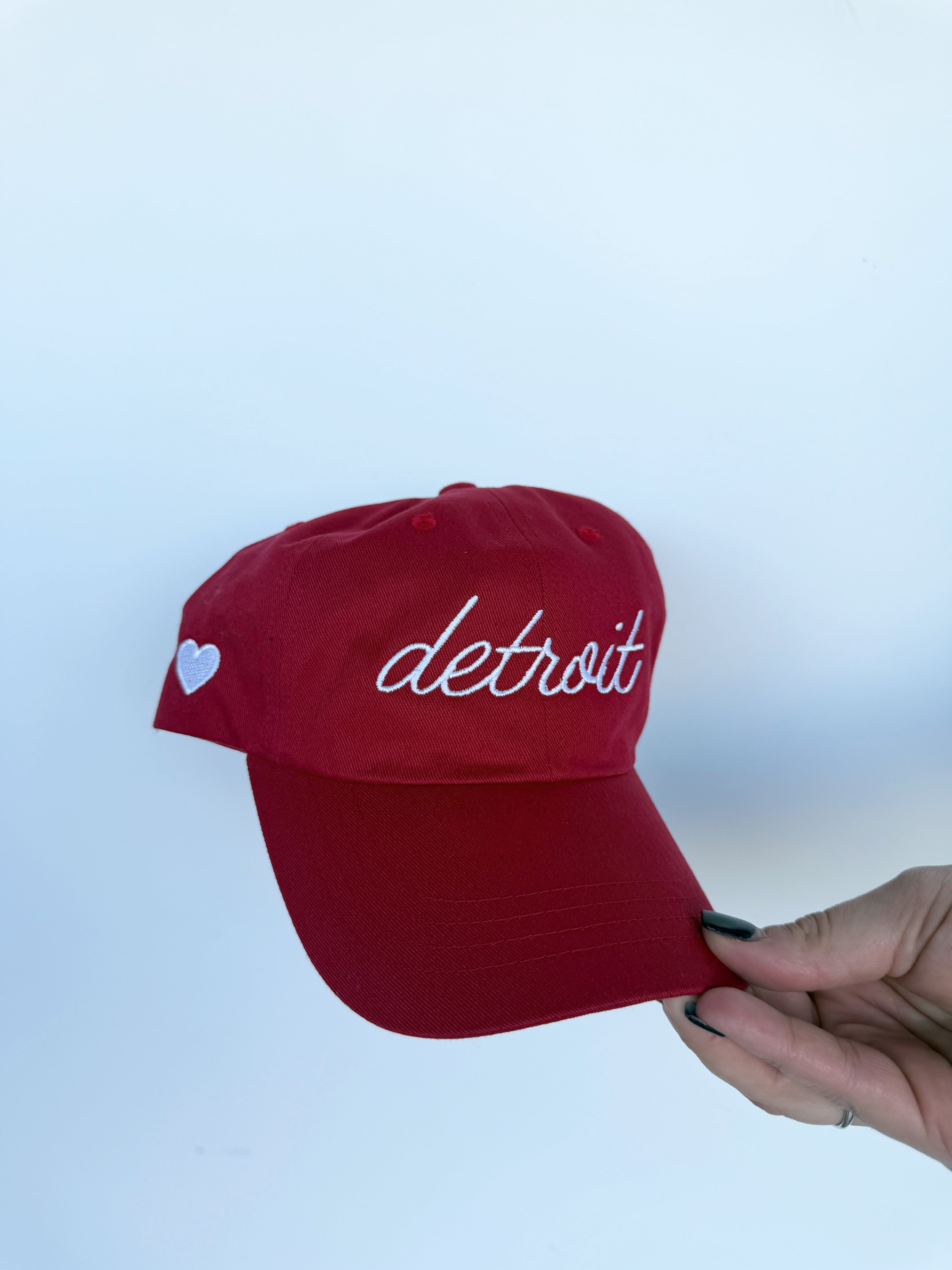 The NEWEST Embroidered Detroit Hat to add to your Collection! This Red Detroit Dad Style is embroidered in white with Detroit script + a white heart on the side! The perfect hat for a sports game, travel, workout, or just hangin' out. We're obsessed!