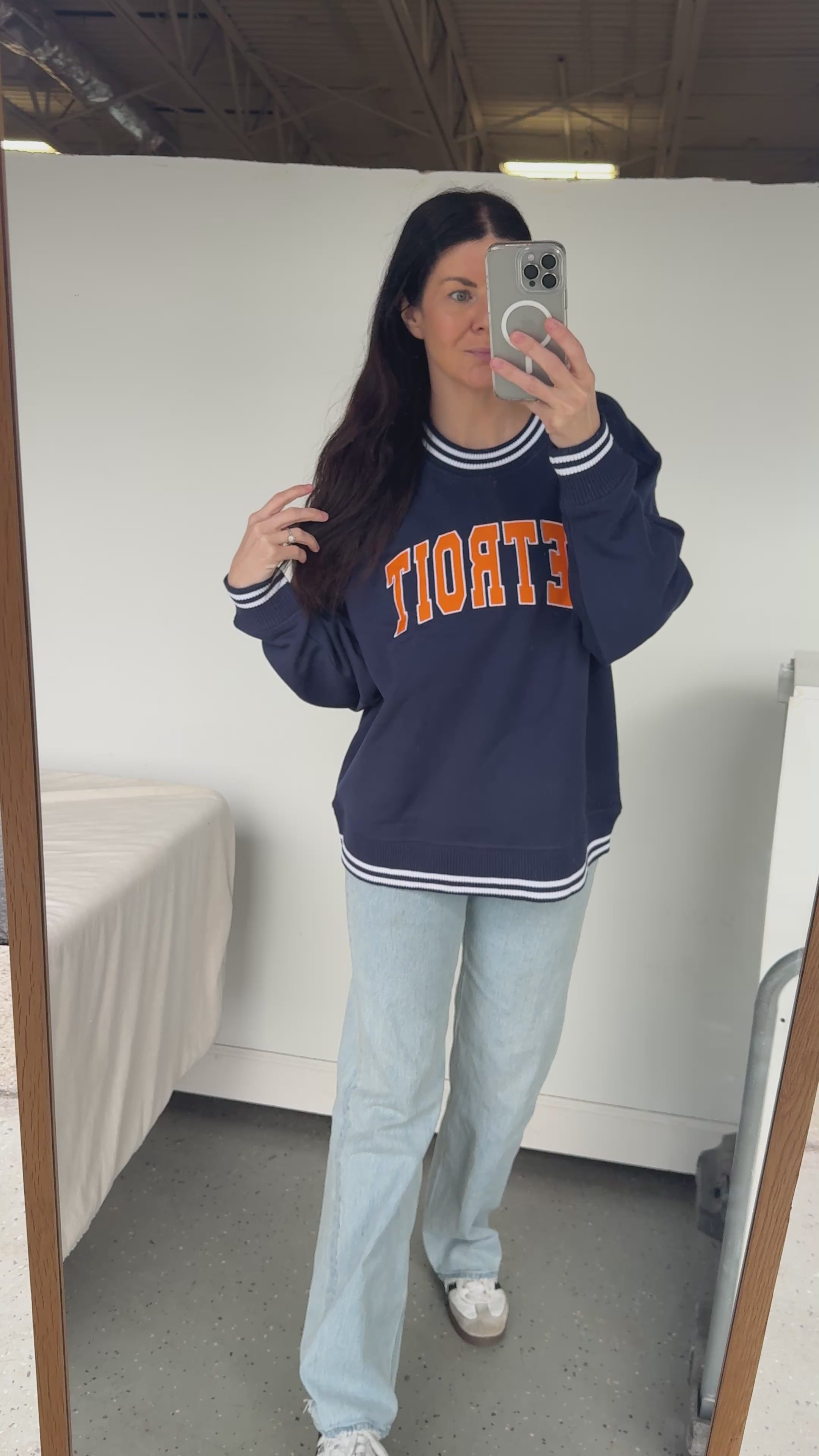 Our NEWEST Signature Oversized Crew with STRIPED DETAILING on the sleeves + neck with embroidered Let's Go Blue + the Block M in Maize is PERFECT for any Michigan Fan! Our custom designed Signature Crews are a Cozy, OVERSIZED FIT and easy to style with jeans for Game Day!