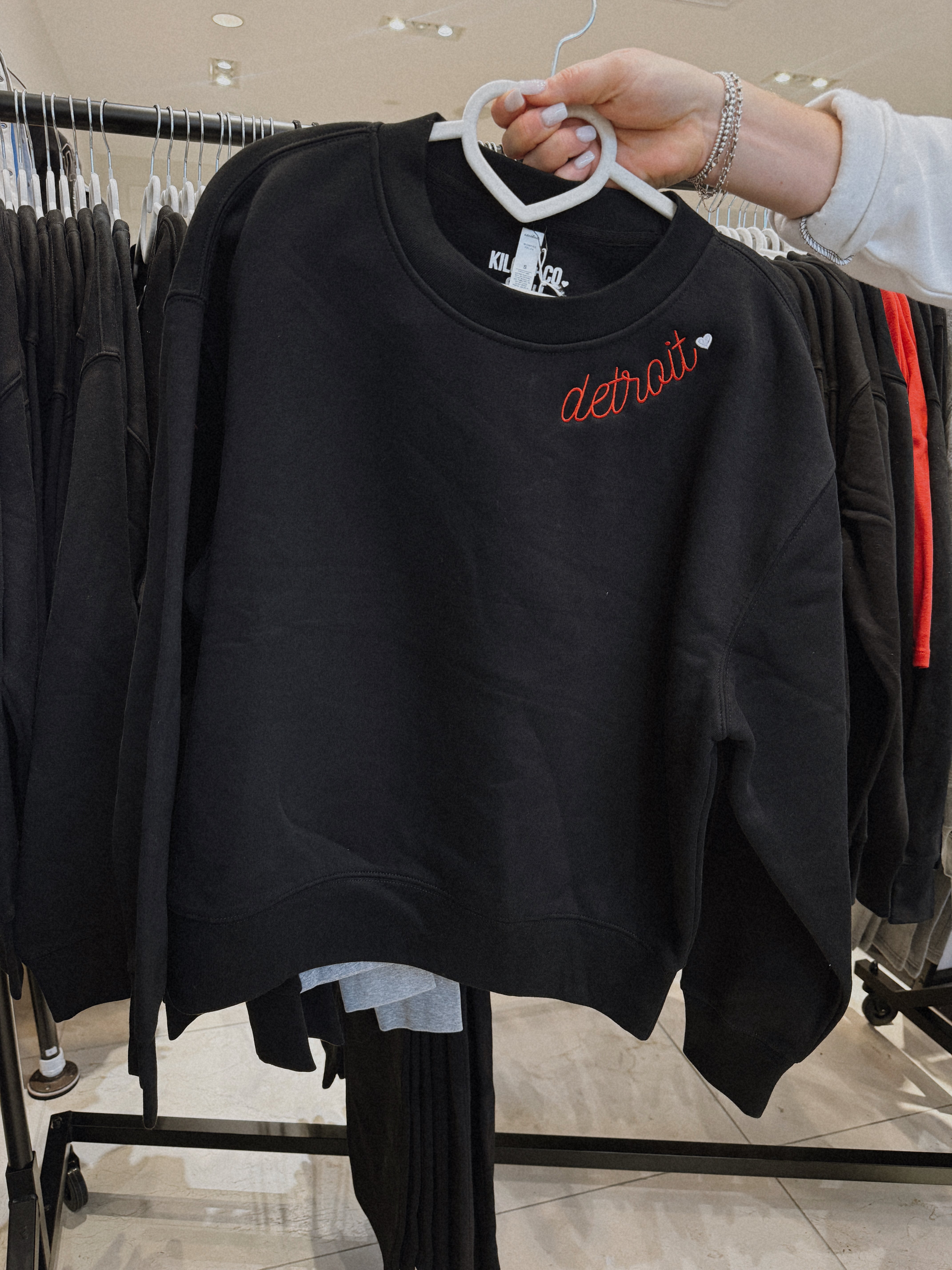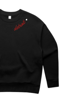 The Embroidered Detroit NECKLINE is BACK and a must have for hockey szn! Our black women's relaxed crew with red Detroit + a white heart embroidered along the neckline is the perfect addition to your wardrobe! We LOVE this crew matched back to our black embroidered heart open sweatpants!