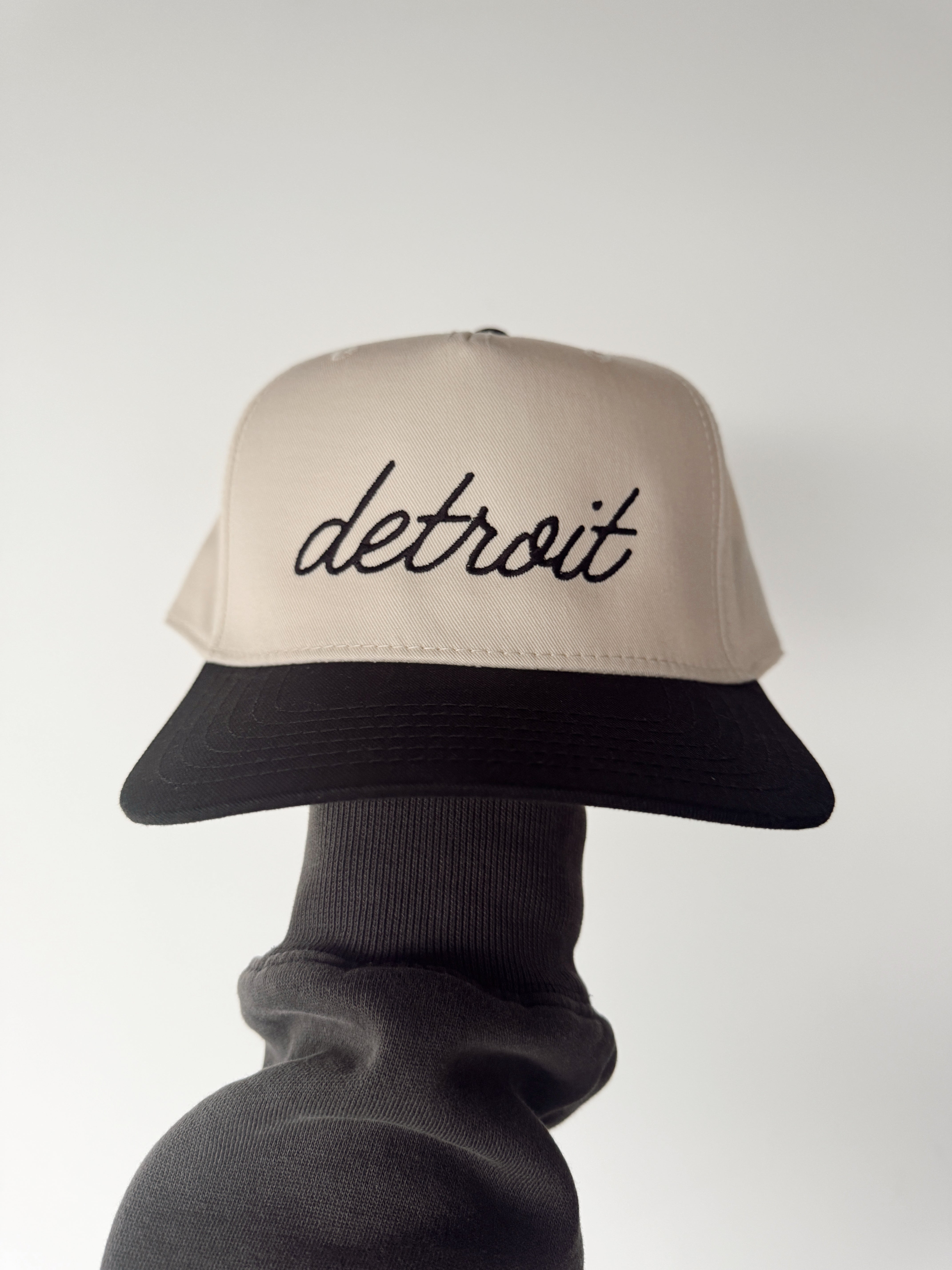 The NEWEST Embroidered Hat to add to your Collection! This two-tone ivory + black hat with embroidered Detroit Script is the perfect hat for your FAVORITE sports game, travel, or to just wear out! We're obsessed!