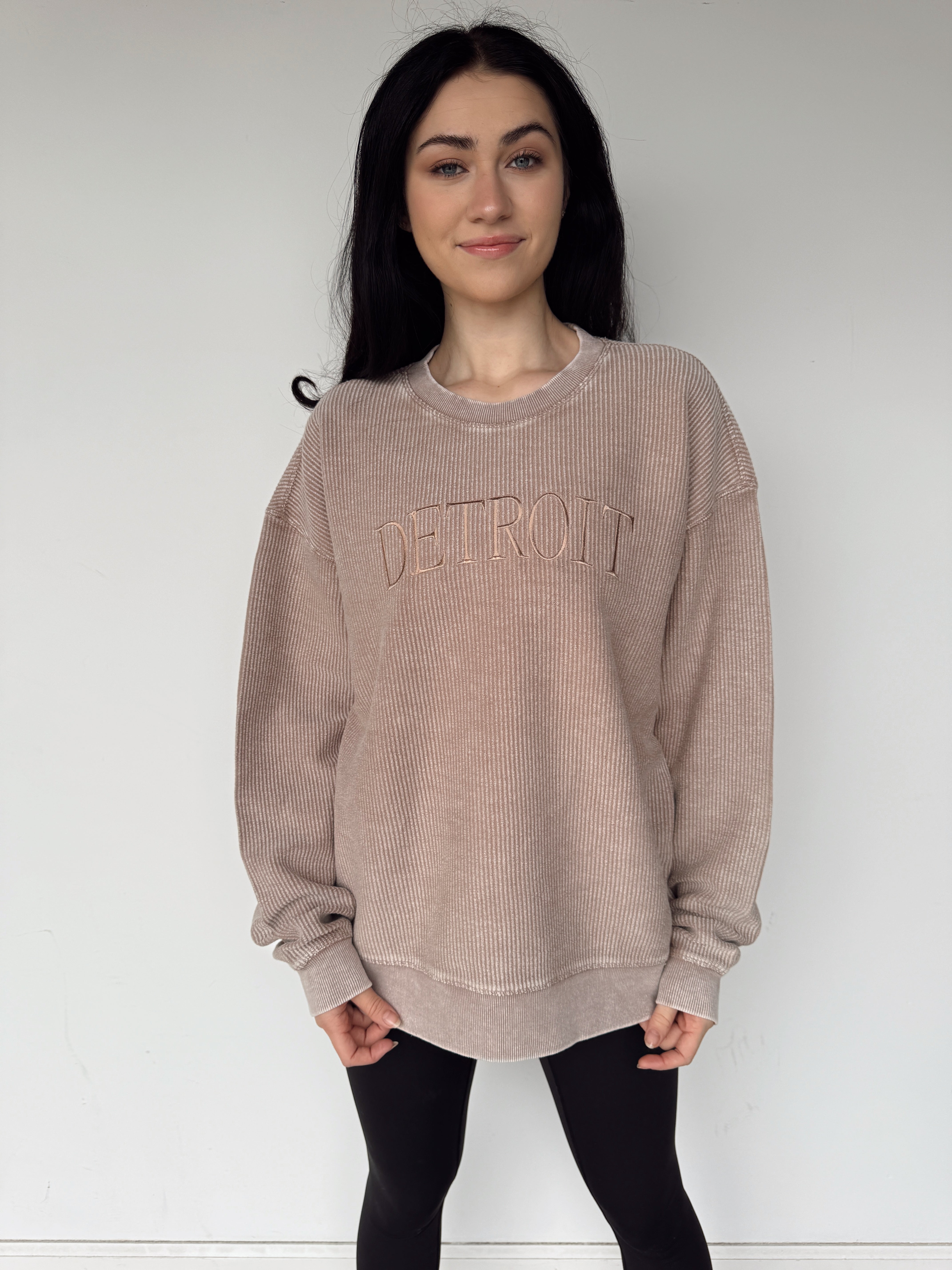 Our Best Selling corded crew style in the NEWEST, Must Have Shade of Brown! We named this color Hot Cocoa and Embroidered Detroit across the front in the same AMAZING color! NEUTRAL Girlies this corded crew allows you to style it back to all your closet staples. Styling options are endless, but this crew is intended to be worn slightly oversized in fit.