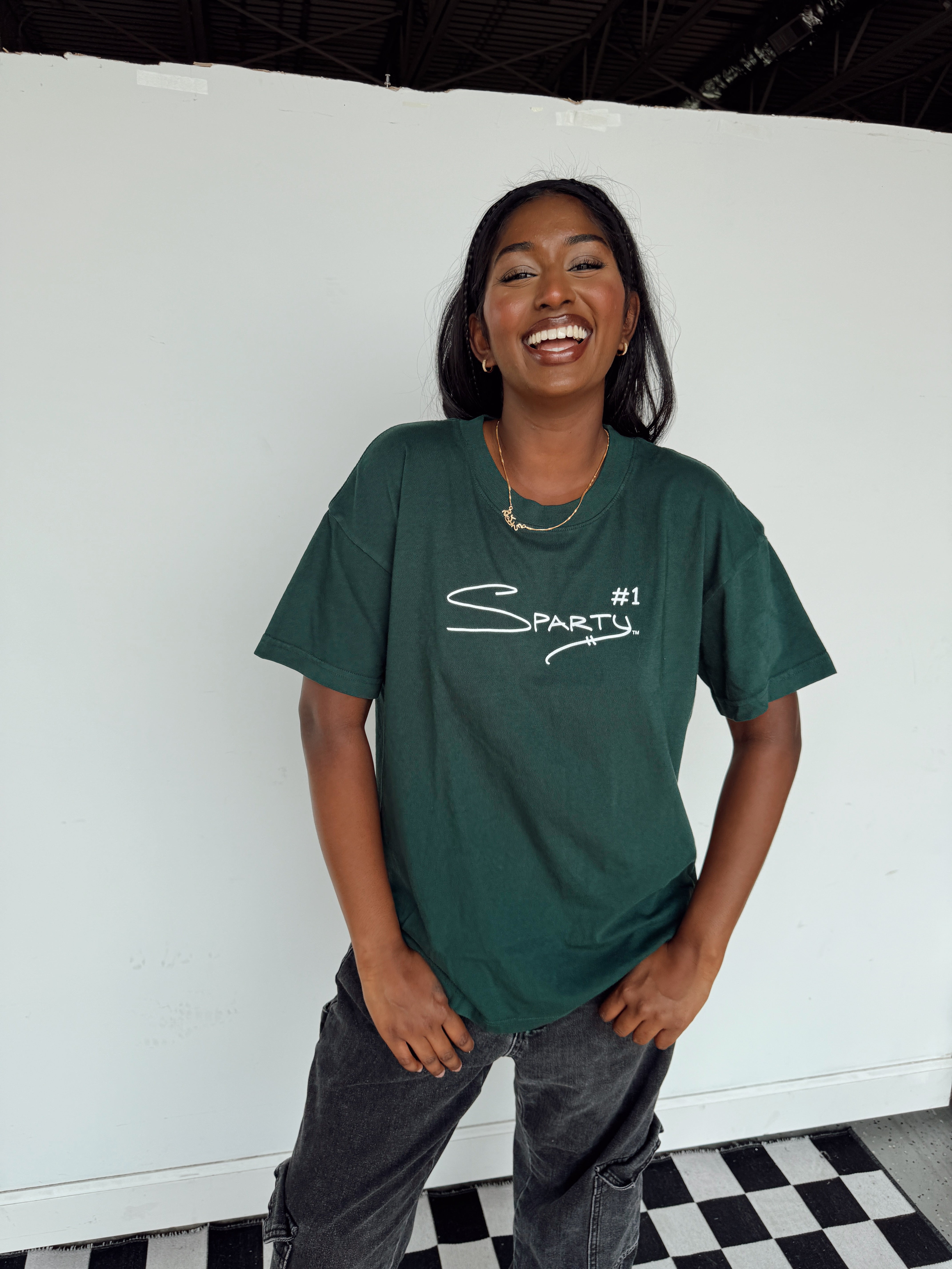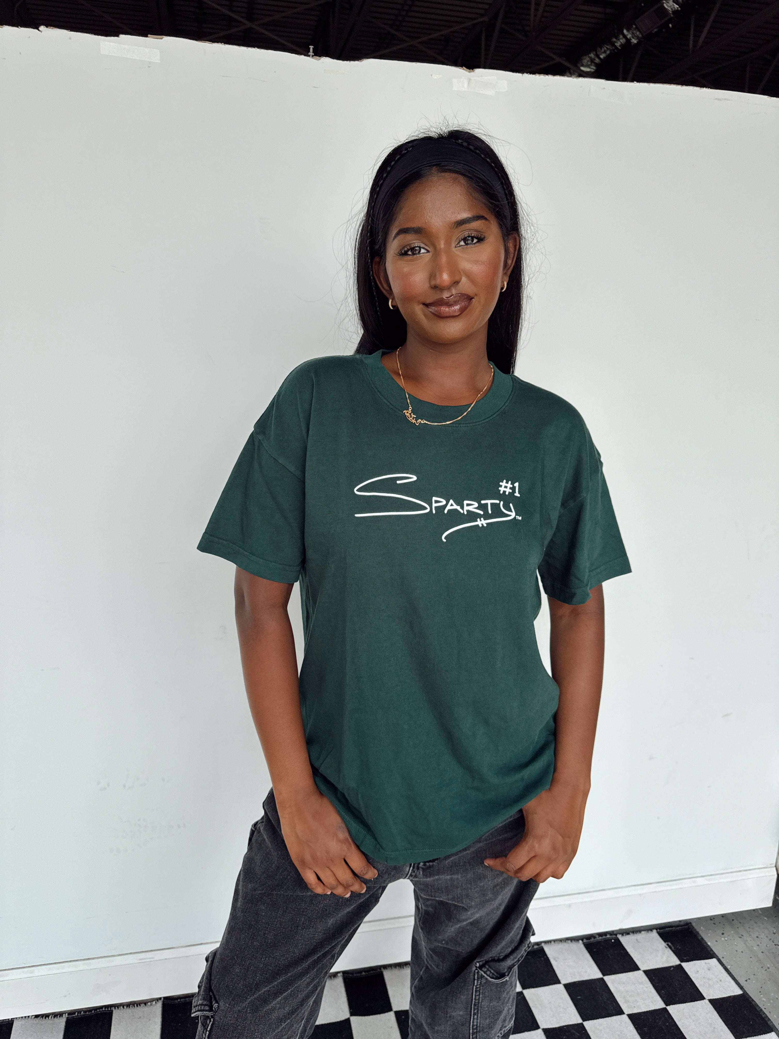 The NEWEST Design for our Collegiate Collection is HERE, the SIGNATURE of everybody's Favorite Mascot, Sparty! Our FAVORITE Relaxed Tee in the BEST Spartan Green Color with Sparty's Signature across the front screened in White is the perfect addition to any Spartan lover's wardrobe!