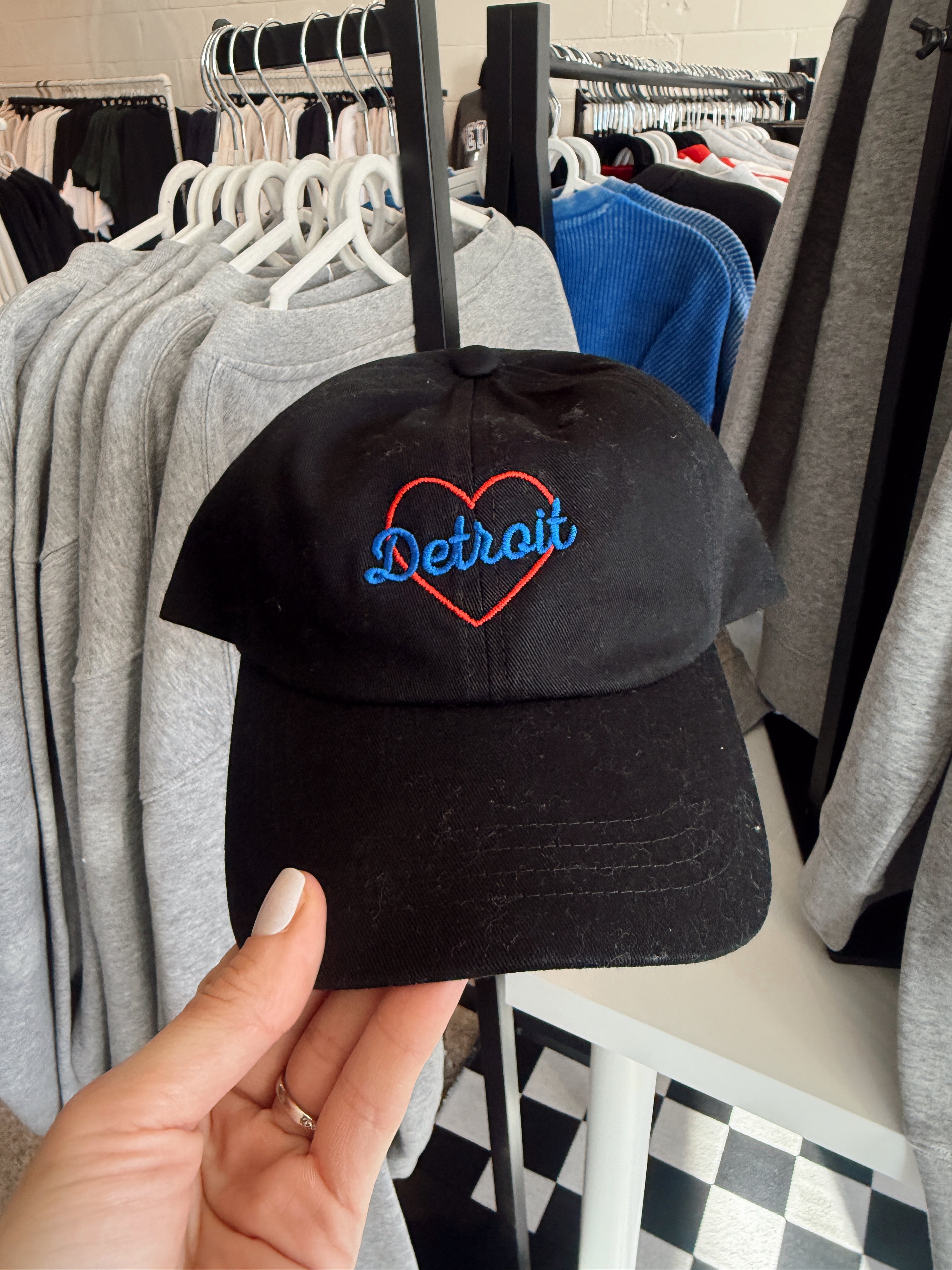 Detroit Red+Blue Heart Embroidered Black Dad Hat