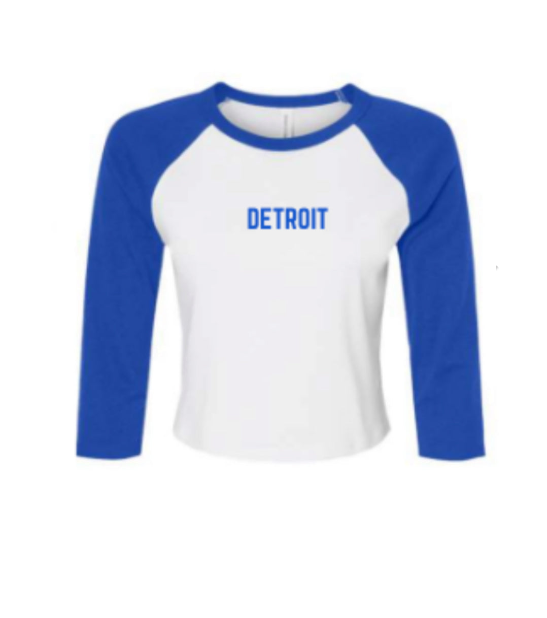 The PERFECT Baseball Style Tee to wear with high-waisted denim, joggers or black leggings! This white tee with blue sleeves and blue DETROIT on the front is simple, but so on trend and versatile! This three-quarter sleeve tee is cropped, so think women's sizing and go up one size if you want a little more room.