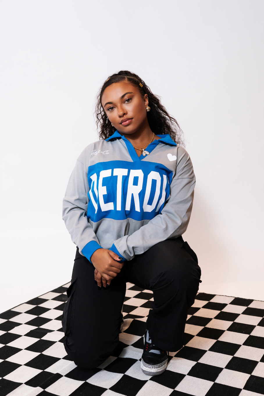 The NEWEST Style to be added to your closet for Game Day is this CUSTOM Long Sleeve Rugby Tee! Elevate your Game Day Style in this fun and totally on trend Detroit rugby shirt! It's grey has a blue collar + center stripe across the chest with our iconic upper case DETROIT in white. We are OBSESSED with this new style and all the styling options! A must-have for your Game Day Collection!
