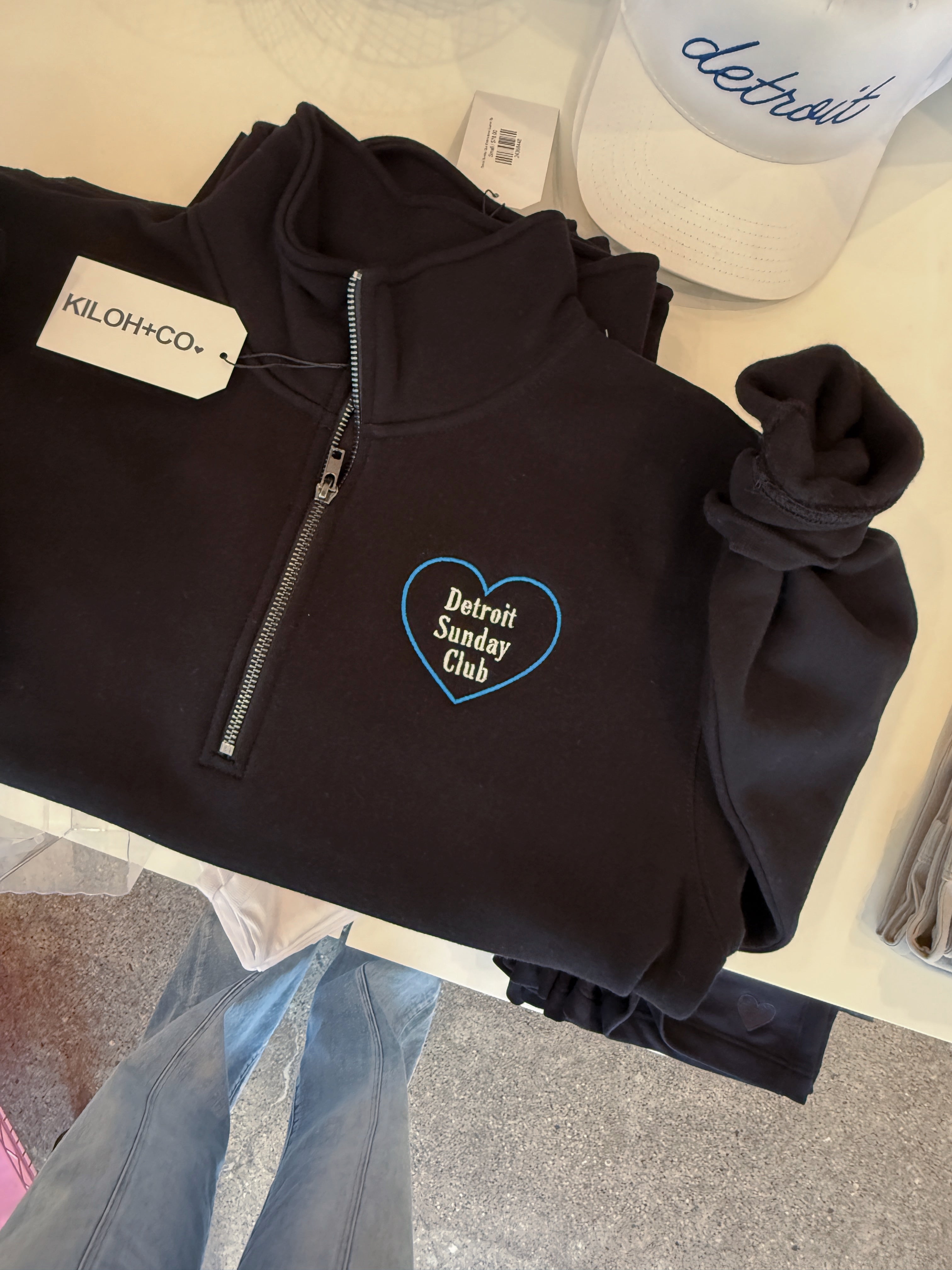 We are LOVING a quarter zip, so we wanted to add one to this collection! This Embroidered Detroit Sunday Club quarter zip is a must have! This quarter zip is perfect for your cozy sundays! We love styling this as a matching set with our Sunday Club embroidered joggers!