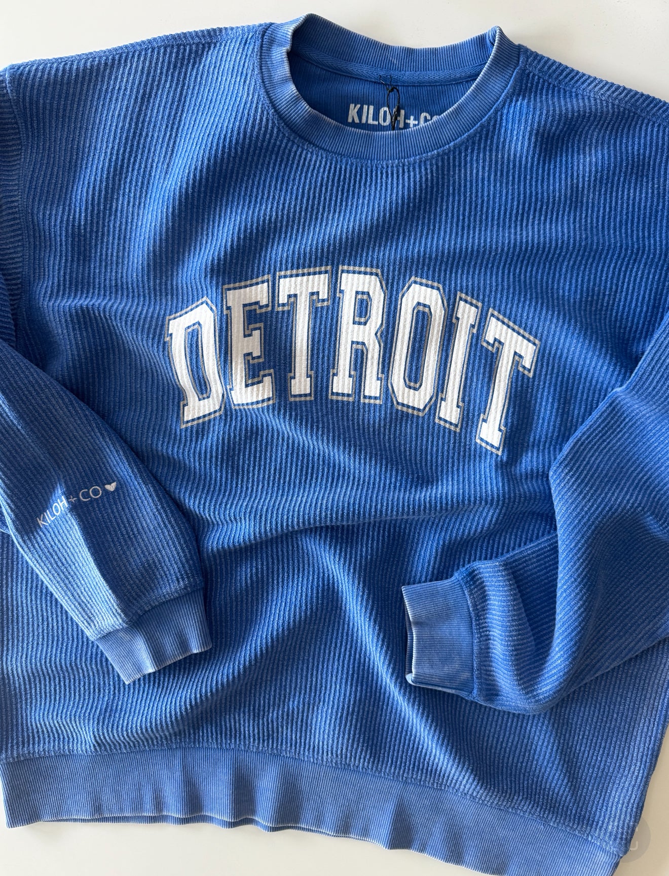 Our Best Selling corded crew style is BACK in Blue with an NEW design!!! The blue color is AMAZING with our signature Varsity DETROIT font in white with grey outline really POPS across the chest! We love the vintage vibe of this one! Styling options are endless, but this crew is intended to be worn slightly oversized in fit.