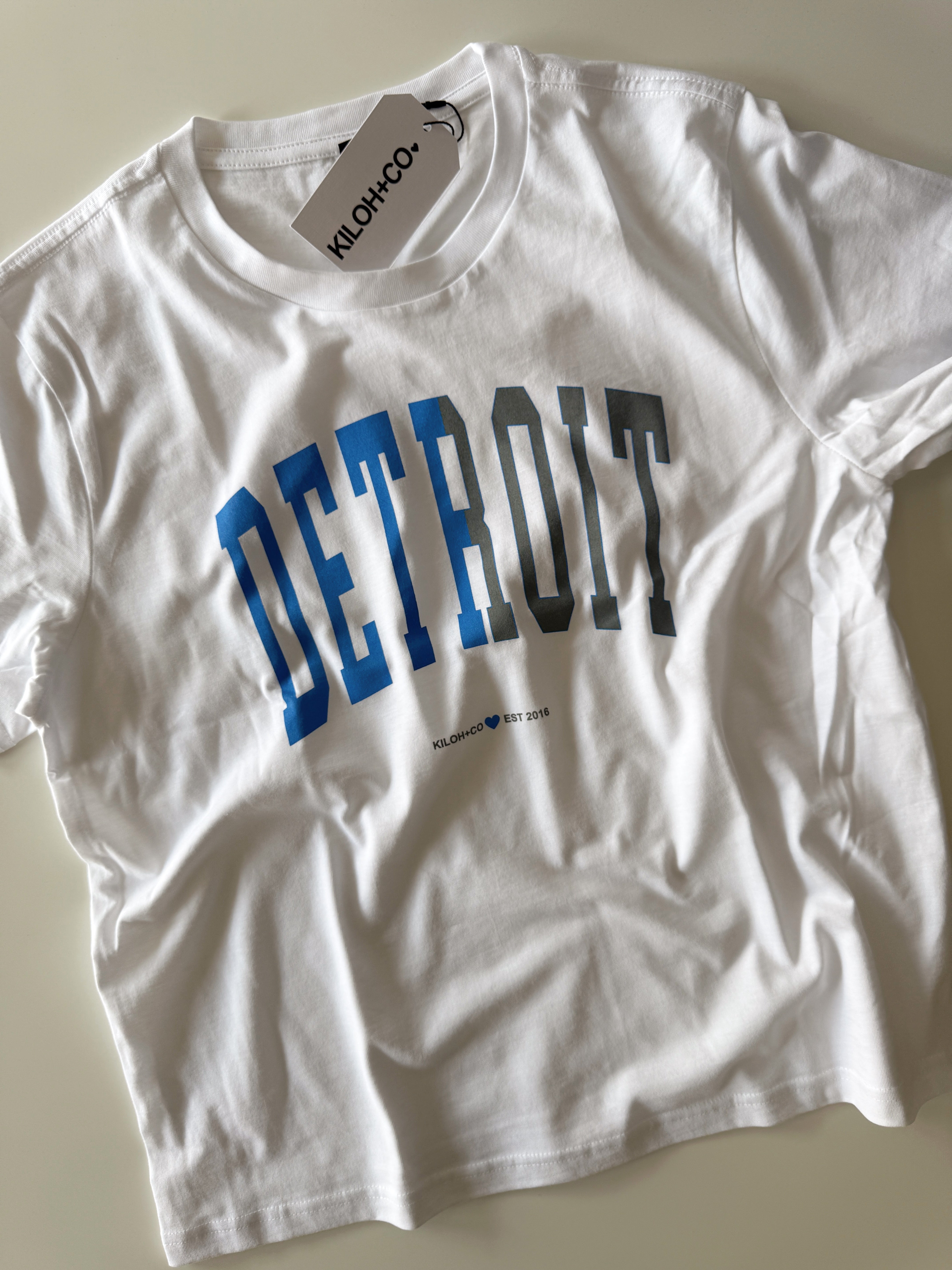 The NEWEST tee style to be added to this collection is a MUST HAVE for Game Day! An on- trend women's fit that hits right at the waist is so easy to just throw on with shorts, denim or leggings! This white tee features our FAVORITE blue & gray split graphic and is perfect for Football SZN!