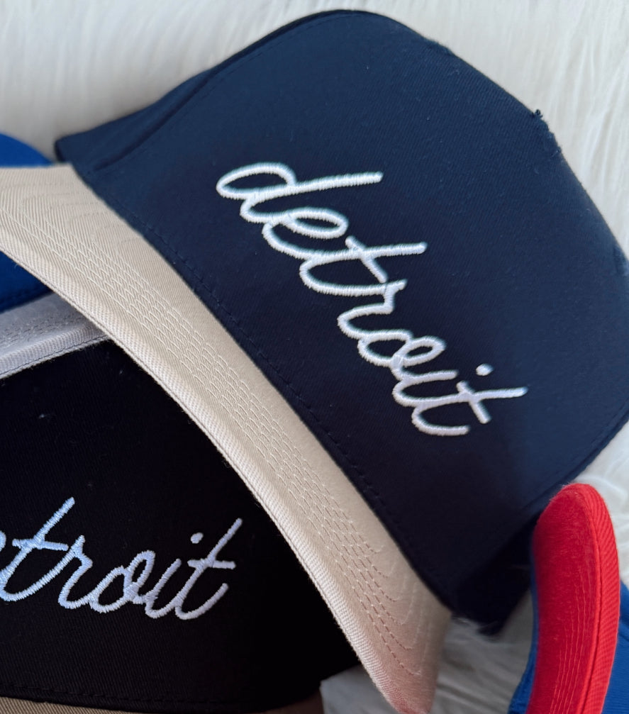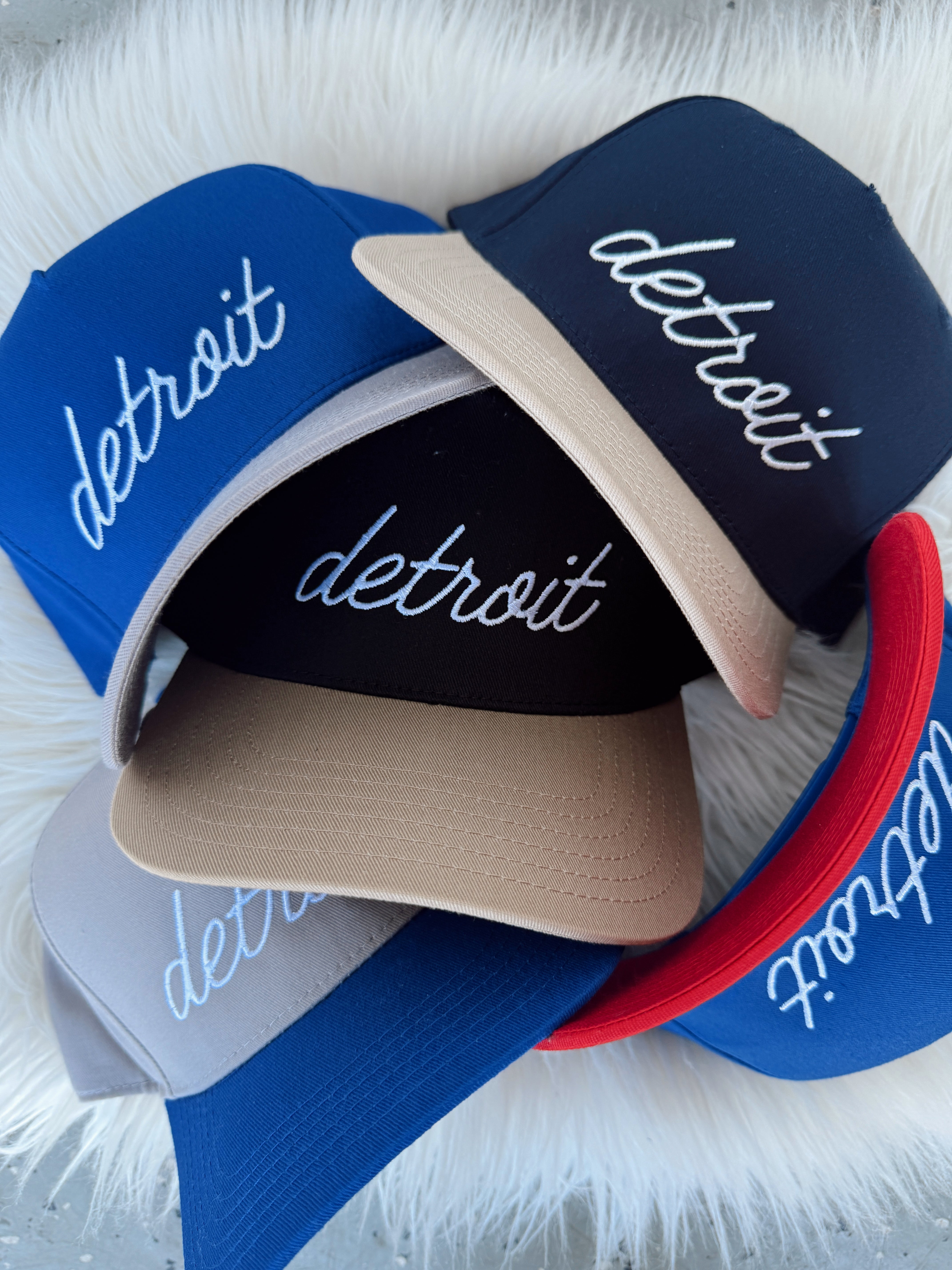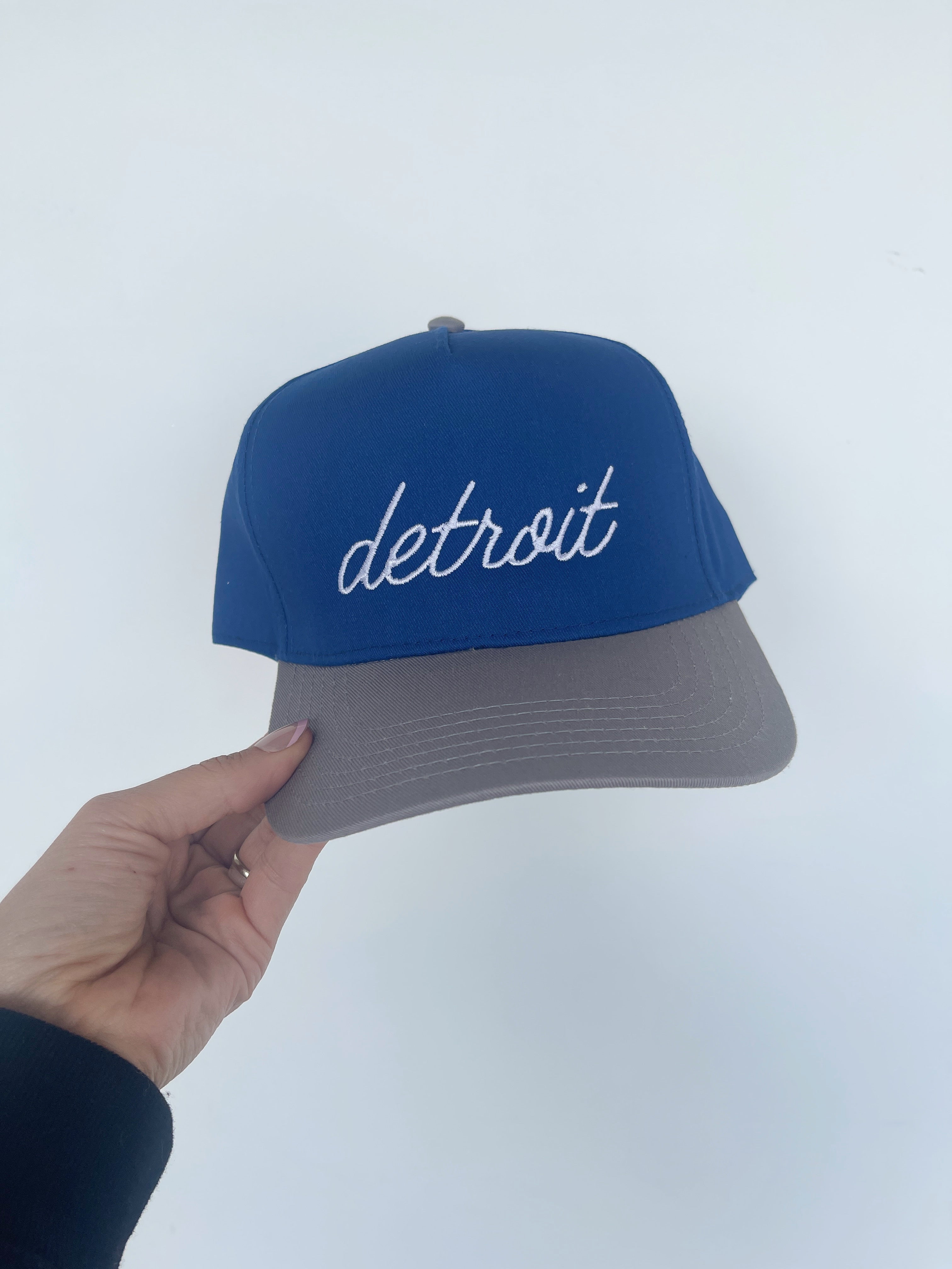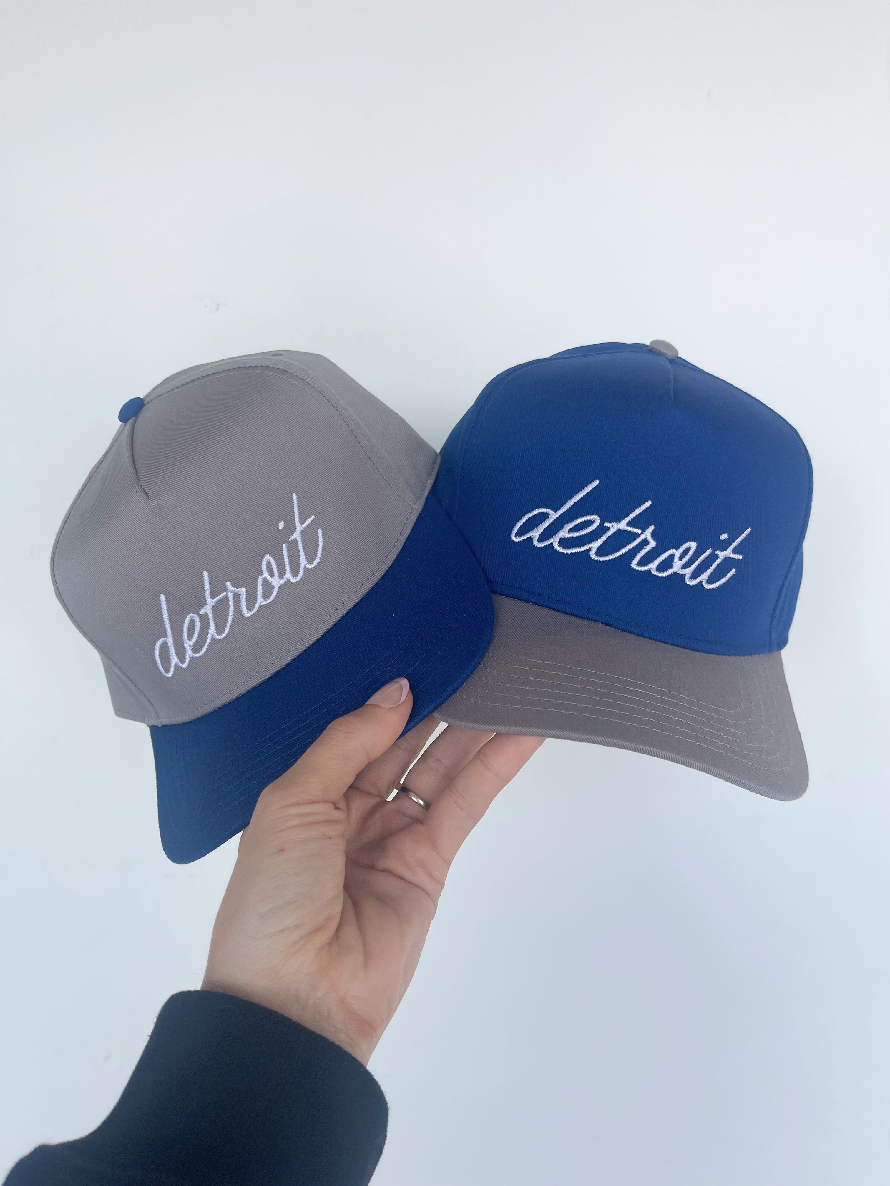 The NEWEST Embroidered Hat to add to your Collection! This two-tone blue + grey hat with embroidered Detroit Script is the perfect hat for your FAVORITE sports game, travel, or to just wear out! We're obsessed!