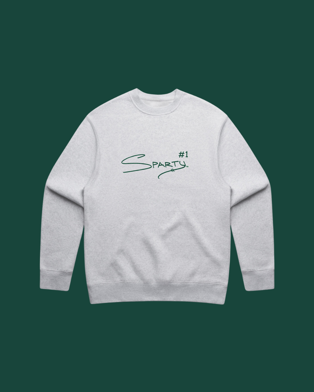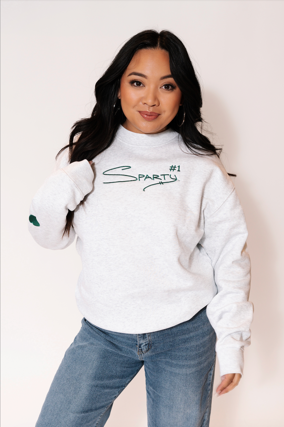 The NEWEST Design for our Collegiate Collection is HERE, the SIGNATURE of everybody's Favorite Mascot, Sparty! Our NEW + Super Cozy Unisex Crew is PERFECT for any Spartan Fan! Sparty's Signature Embroidered on the front with embroidered green kiloh +co on the sleeve is a MUST HAVE for any Spartan Fan!