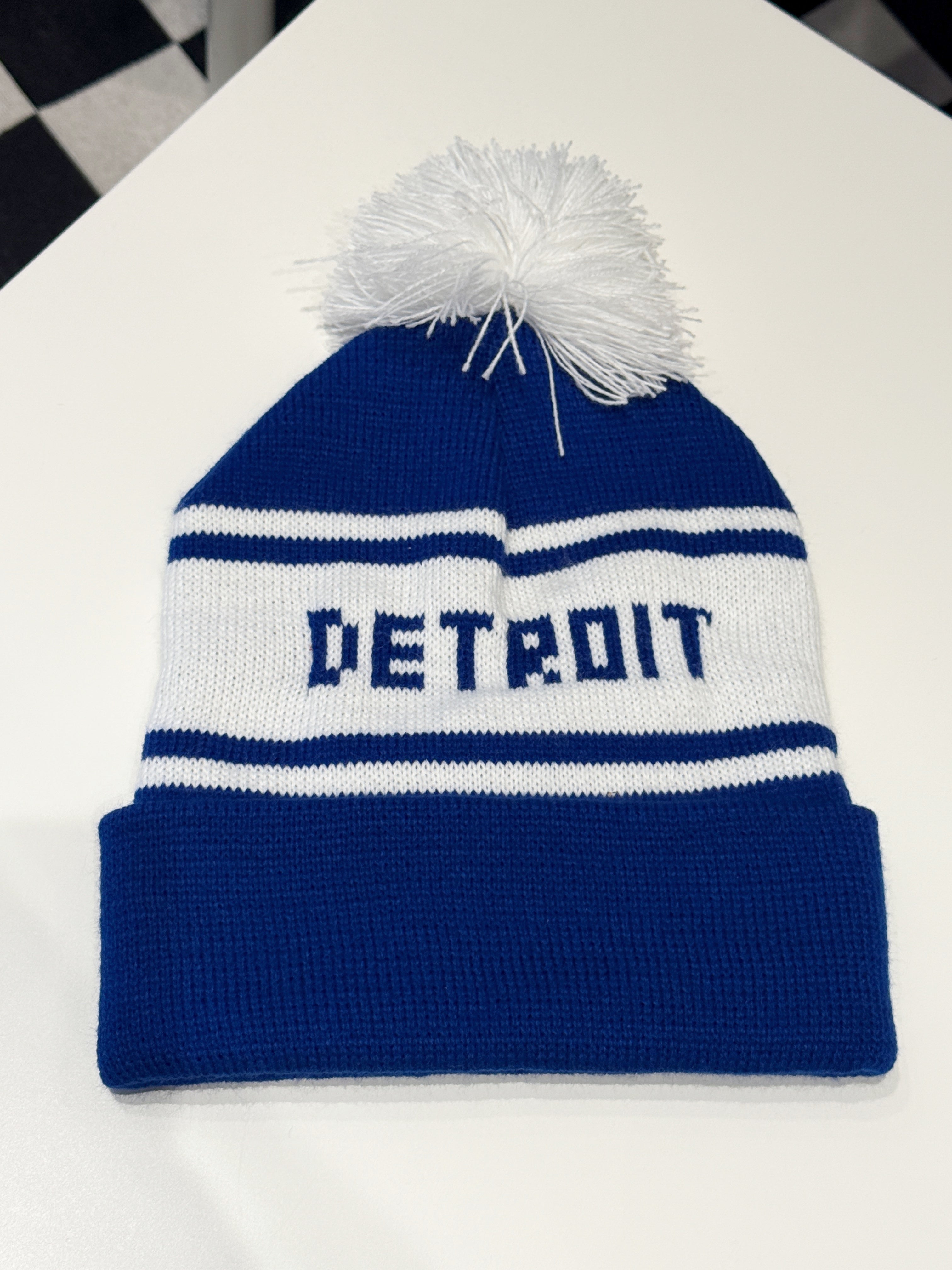 Cozy up with this knitted Blue + White Detroit winter hat! Perfect for your favorite sports games or staying warm in the frigid Michigan winters! The perfect gift for the Detroit lover!