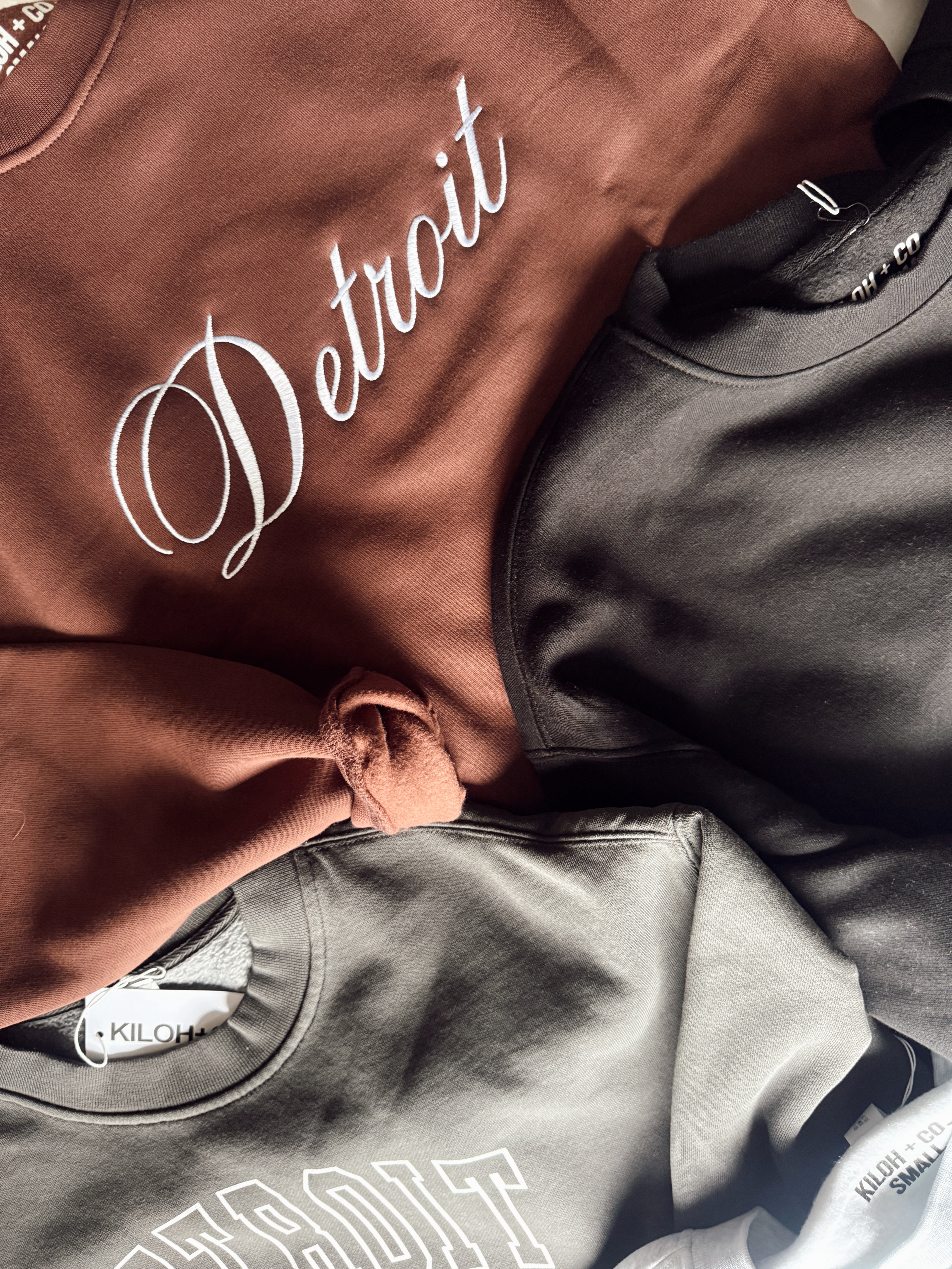 The PERFECT Crew Collection for our Neutral Girlies! This crew style is so comfy + cozy, perfect for an everyday look! WE LOVE this chocolate brown crew with Detroit embroidered in white across the front! This one is totally on trend and a must have! This style is perfect with joggers, leggings or jeans! Stay stylish and cozy all season long!