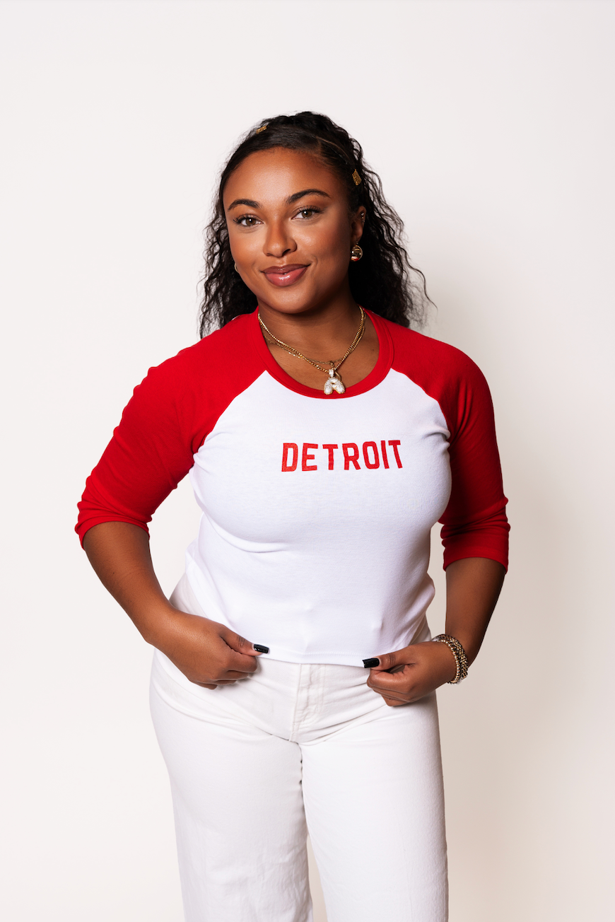 The PERFECT Baseball Style Tee to wear with high-waisted denim, joggers or black leggings! This white tee with red sleeves and red Detroit on the front is simple, but so on trend and versatile! This three-quarter sleeve tee is cropped, so think women's sizing and go up one size if you want a little more room.