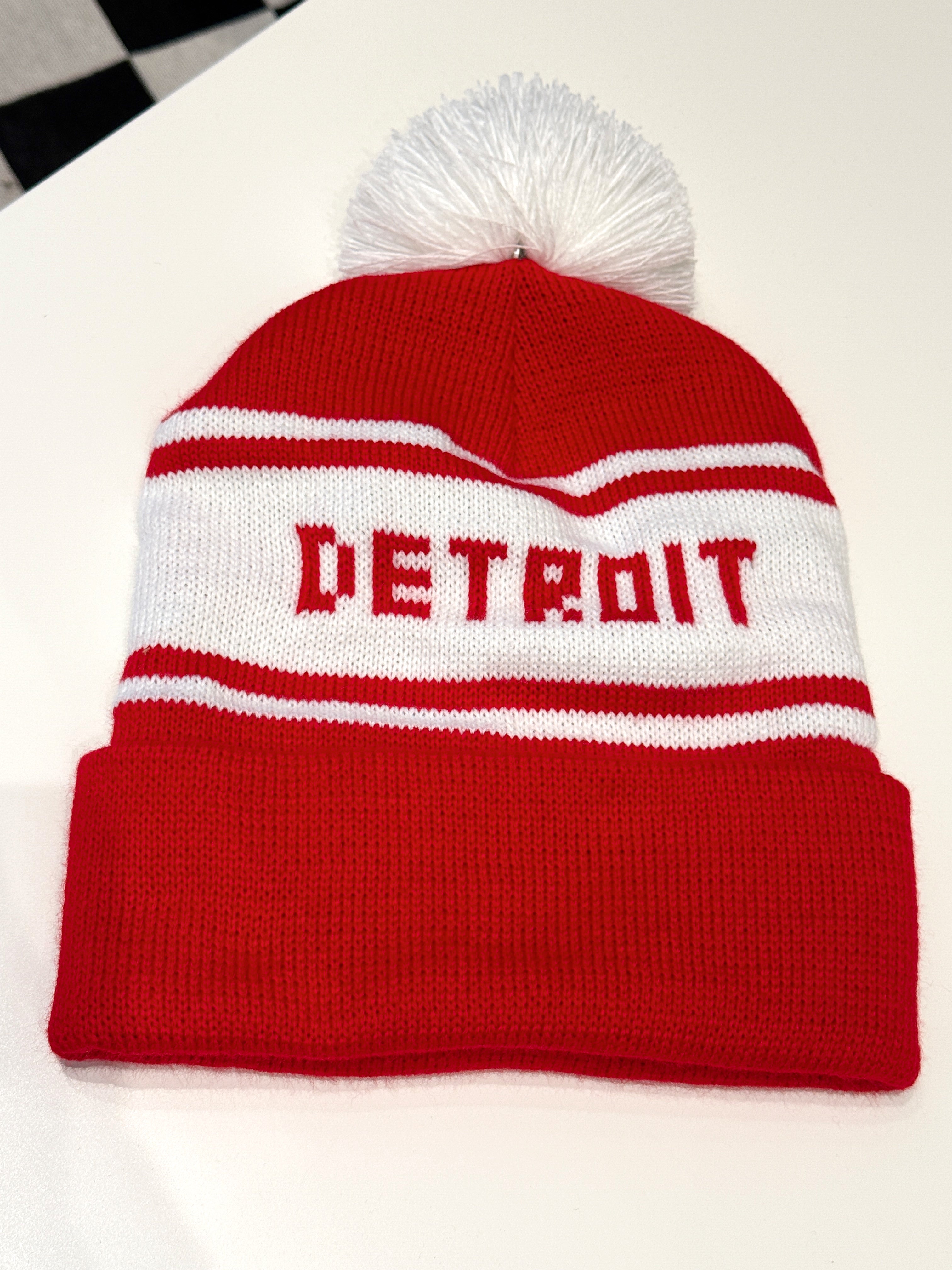 Cozy up with this knitted Red + White Detroit winter hat! Perfect for your favorite sports games or staying warm in the frigid Michigan winters! The perfect gift for the Detroit lover!