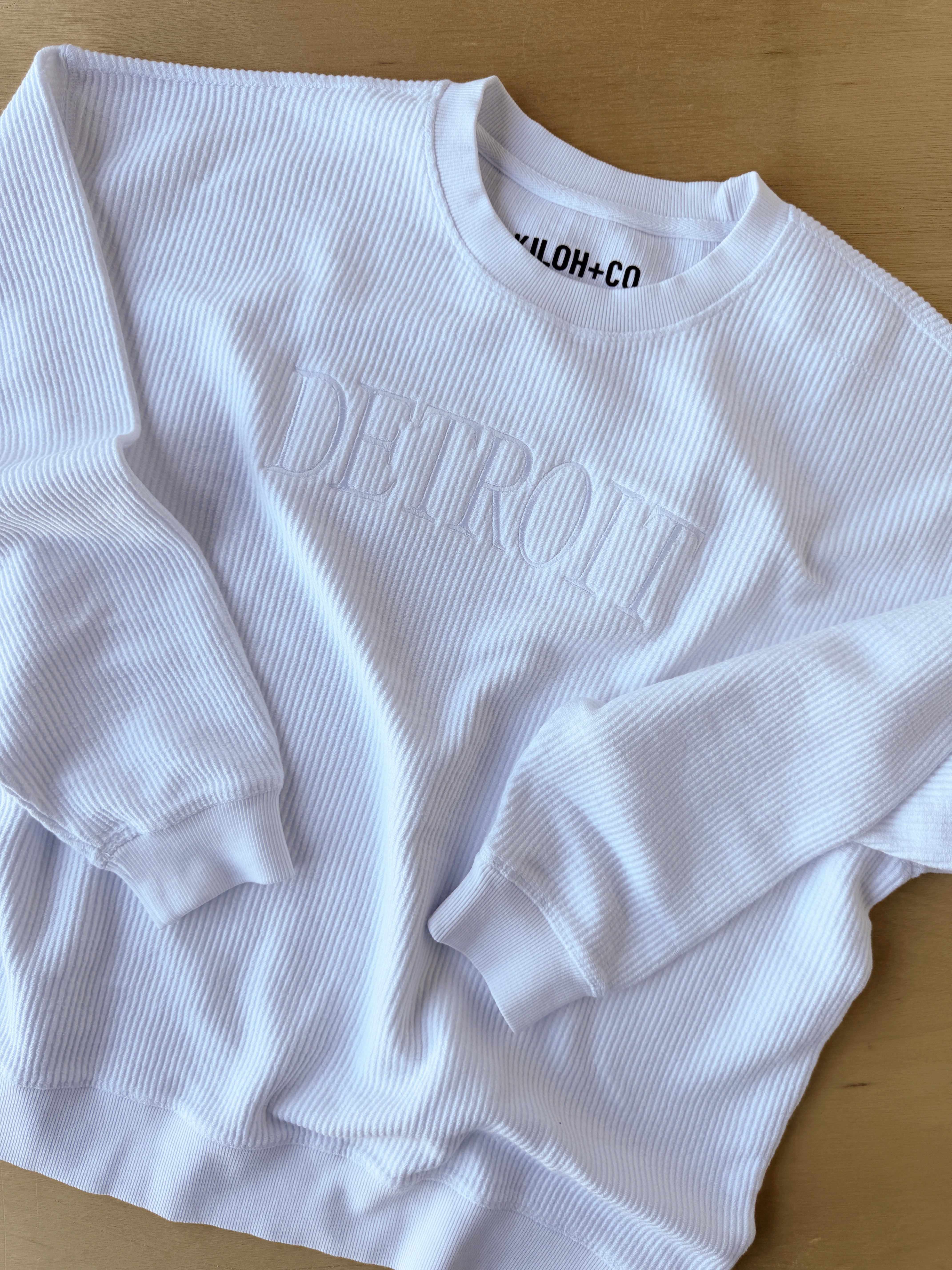 Our Best Selling corded crew style in White with White Embroidered Detroit across the front! NEUTRAL Girlies this corded crew allows you to style it back to your FAVORITE Teams colors or keep the neutral vibe going. Styling options are endless, but this crew is intended to be worn slightly oversized in fit.