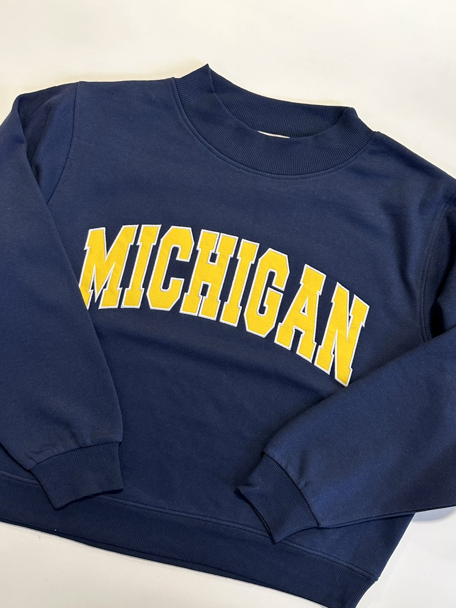 We are so excited to add this licensed University of Michigan women's mockneck to our Game Day wardrobe! This navy blue mockneck with our Maize+White MICHIGAN Patch embroidered graphic is PERFECT for any Wolverine Fan! This mockneck will definitely have you standing out on game day! This totally on trend style is PERFECT to wear with jeans or leggings.
