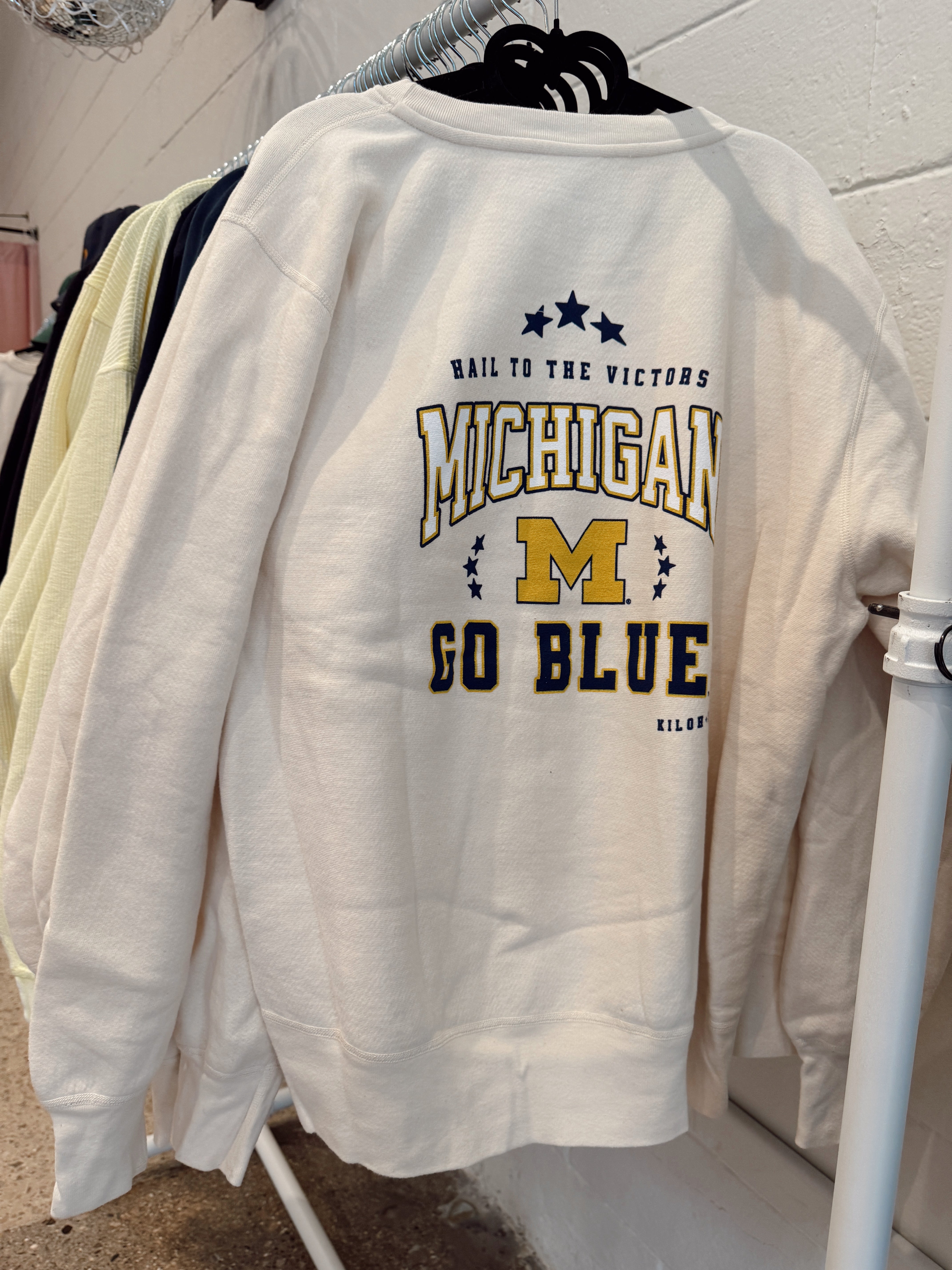 The Fall Licensed Collegiate Collection is HERE!! Our Vintage Wash sweatshirt is a Customer FAVORITE, splurge-worthy item for your Game Day Wardrobe! Our NEWEST Collegiate Crew in the natural, ivory/bone colored fabric with a Block M on the front and a Fun, NEW Michigan graphic on the back! This crew is perfect for any University of Michigan lover's wardrobe! Styling options are endless!