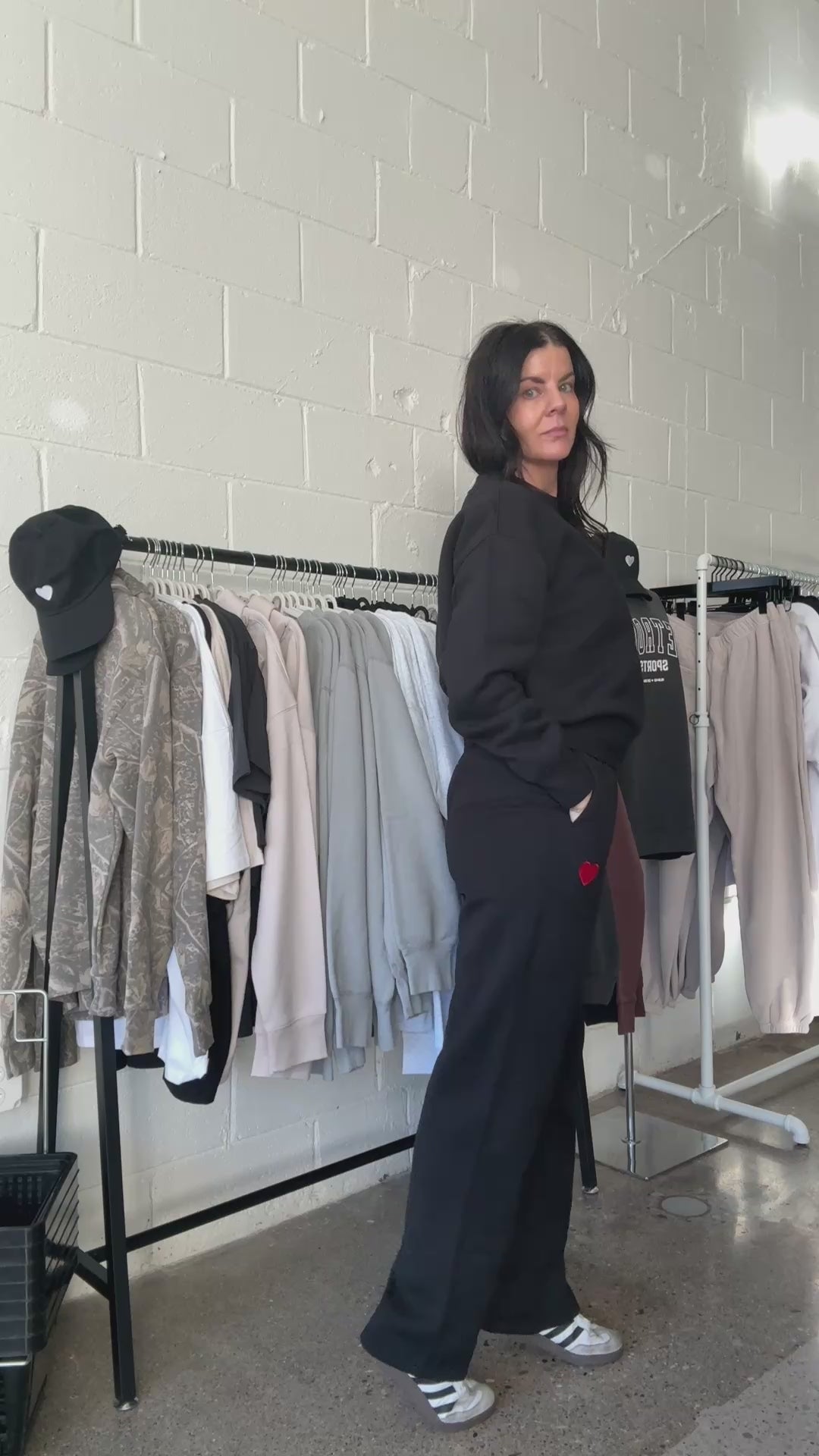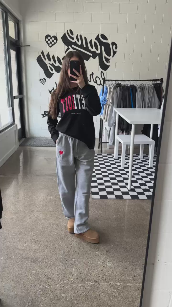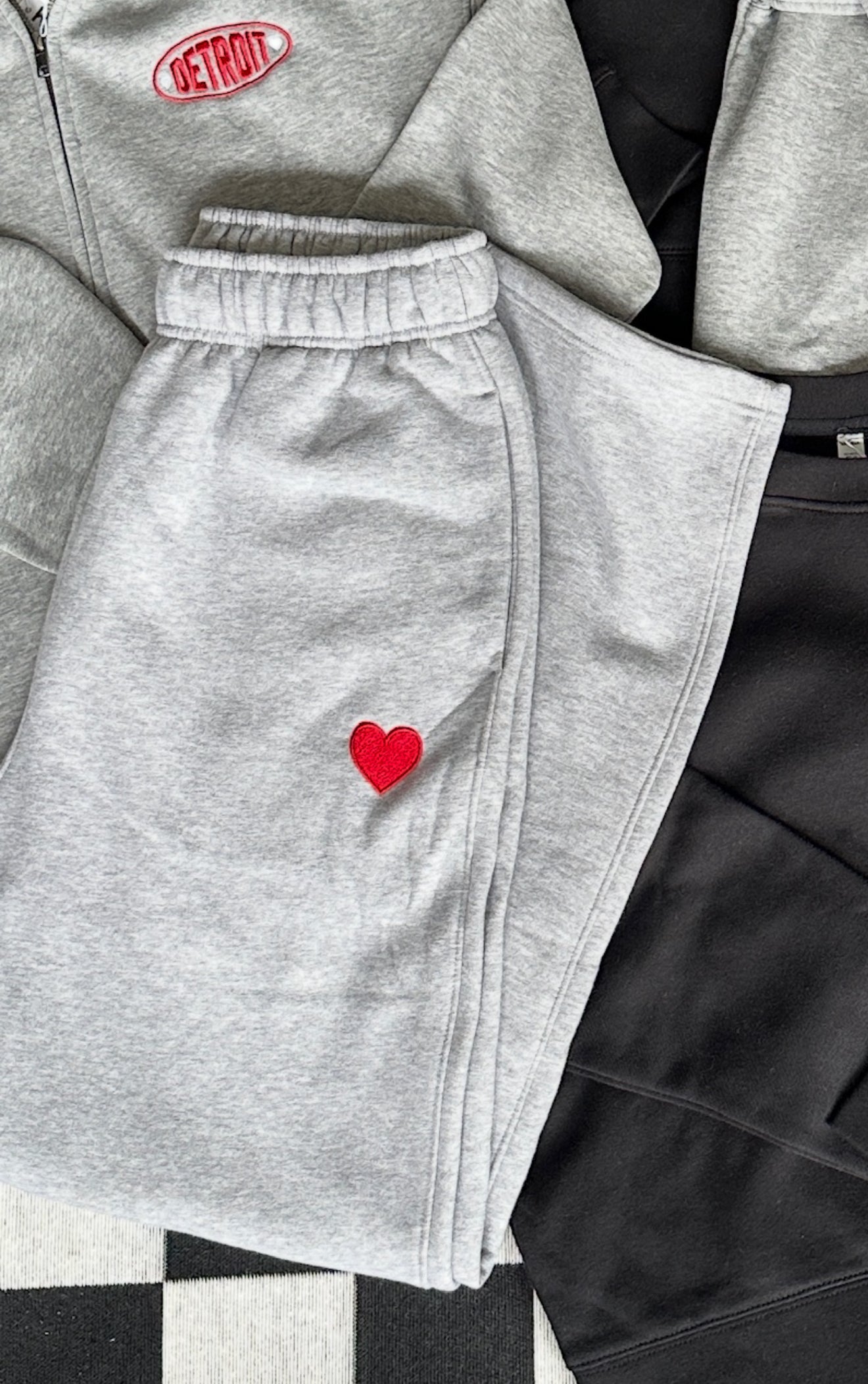 We LOVE a matching set, so we added these athletic grey sweatpants to our newest hockey szn collection! We love the little red embroidered heart detail on these! The sweatpants your wardrobe has been wanting and make it a matching set with our athletic grey zip up hoodie!