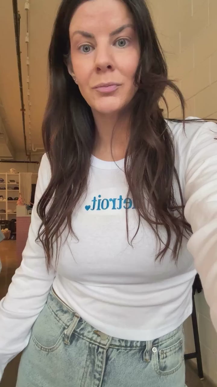 The PERFECT Crop Style to wear with high-waisted denim + joggers, so we added a white option! This White Long Sleeve tee with Detroit embroidered in BLUE on the front is simple, but so on trend and versatile! This tee is cropped, so think women's sizing and go up one size if you want a little more room. Similar in fit to our cropped baseball tees.